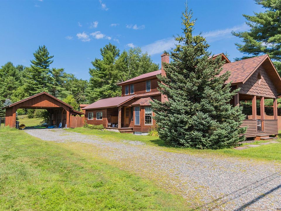This beautiful year round cedar home is just steps away from the Wells town beach on Lake Algonquin. The home features 3 bedrooms, 2 bathrooms, eat in kitchen, dining room, living room, and a family room. The downstairs has oak floors, pine walls, 2 wood stoves, and a beautiful mahogany bathroom. The front porch features a high ceiling and is a great place to sit and relax. There's a 2 car carport with an attached bar area to the backyard. The outdoor fire pit is fenced in and is a great place to privately entertain family and friends or relax by yourself. The location of this home is convenient to Oak and Gore Mountain ski areas. This is where you want to be to enjoy all the seasons in the Adirondack Mountains! Very Good Condition