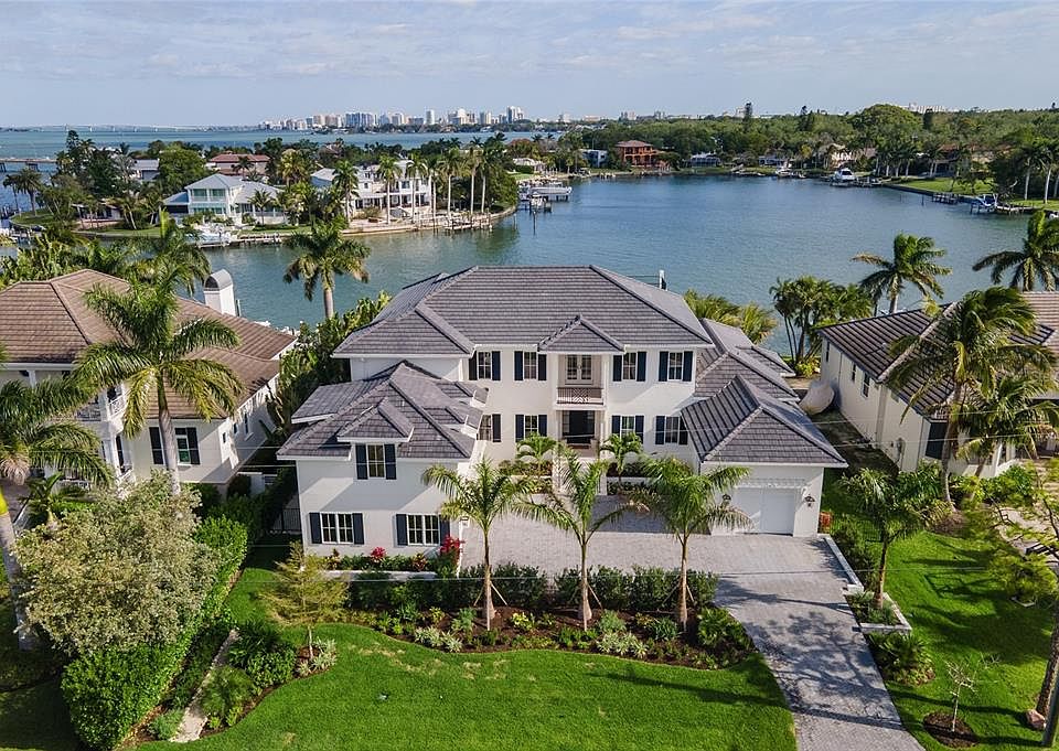 Newly completed home custom built by award winning builder, NC Ferguson Construction. This coastal residence captivates with its impeccably designed décor and outdoor living spaces in a scenic waterfront setting only seconds to the open waters of Sarasota Bay. Located West of Trail, Tangier Way is a quiet street situated centrally to Siesta Key, Southside Village, A-rated schools, and downtown Sarasota. The just under 6,000 square foot home is comprised of state-of-the-art building techniques and nautically-inspired interior details including hardwood floors and a light, airy aesthetic. The thoughtful floorplan begins in the gracious living room where 10’ sliding glass doors overlooking the water makes receiving guests an art. Interior highlights include the formal dining room, gourmet kitchen with eat-in cafe, and family room – centered around beautiful Bay views. Five en-suite bedrooms, private office and a bonus room ensure space for everyone. Two laundry rooms, one upstairs and down, are a true luxury of time and space. Add an elevator or generator for your convenience. Enjoy inspiring Florida evenings as you dine in the outdoor covered entertaining area or savor water views spanning Siesta Key to downtown on the rooftop deck. Every day will feel like a vacation as you soak in your heated pool and spa. A new seawall and cap complement the boating experience. Custom built by award winning luxury home builder, NC Ferguson Construction.