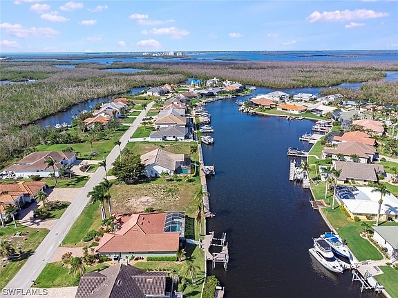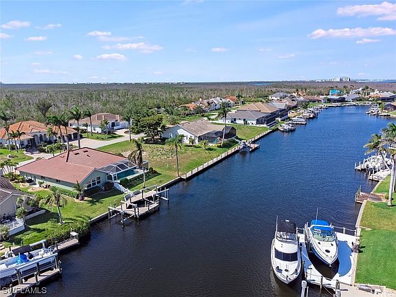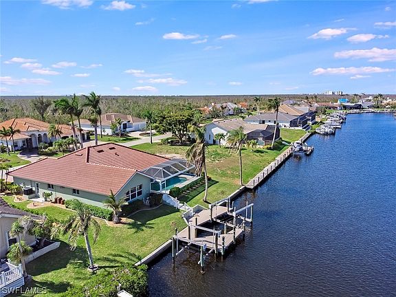 Palm Acres waterfront home built high and dry on Caleb Drive overlooking wide deep-water direct gulf-access canal with long water basin views through big picture window pool cage. Built in 1997 on 96ft of linear seawall, this 2,241 sq ft, 3 bed, 2 bath pool home has high ceilings, pocketing glass doors, formal living room, formal dining room, and separate family room. The masterfully situated family room enables commanding views of the wide saltwater canal, sailboat basin, sunsets, dolphins, manatees, swimming pool, and dockage. Boating access includes a large wrap-around pvc decking dock with a 10,000 lb boat lift, a 4,500 lb boat lift, and fish cleaning station. Master suite has two walk-in closets, jetted tub, separate shower, dual sinks, and bidet. Tile roof is brand new in 2023! Palm Acres near the Sanibel Causeway is well known locally for quickly accessing the Gulf of Mexico by boat and world-class snook fishing. Among the recognized elite four waterfront communities in Fort Myers, this property on Caleb Drive in Palm Acres is the best you will find during your search. Watch the video, view the photos, and call now.