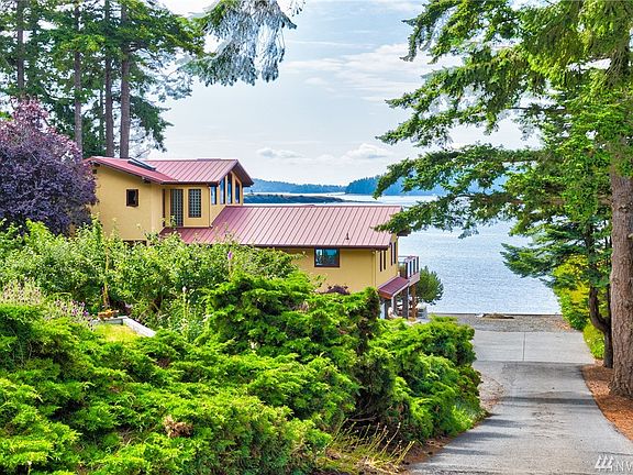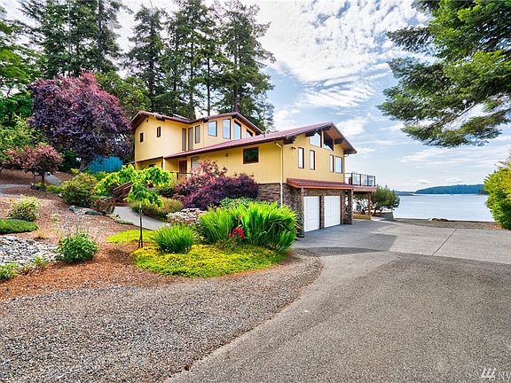 Islands and Mountains! A 180 degree view from this stunning waterfront home. Great room has vaulted ceilings, Loewen windows and french doors leading to a fabulous Tiger Wood deck and 130' of medium bank waterfront. 2900 sq feet of unique luxury. Large kitchen boasts custom cherry cabinets, artisan concrete countertops and South American Wood bar. Beautiful Master Suite with fossilized limestone in the Master Bath. 2 bedrooms, office and bonus room. Radiant heat floors. Beach Rights