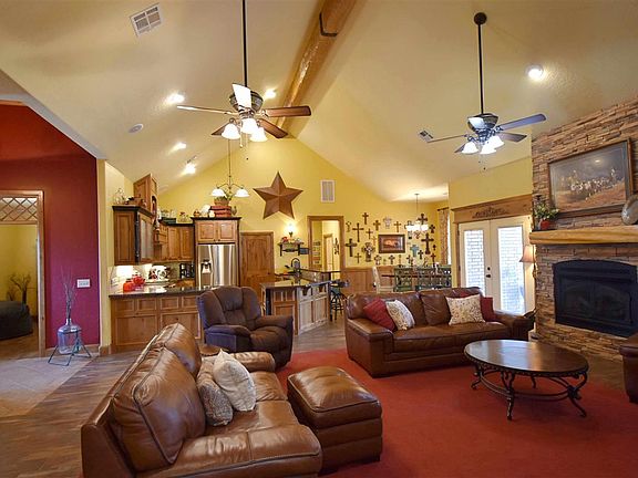 Stunning custom built one owner home on 6.88 acres with mature trees located east of Elgin. This approx 3100 sq. ft. home has 4 bedrooms, 2 3/4 baths plus 2 living rooms. Open floor plan with wood-like tile flooring throughout with only carpet in bedrooms. Large covered front porch and back patio for extra entertaining space. Separate office or 2nd living area has plantation shutters. Spacious living room has cathedral ceilings, propane gas fireplace and built-in cabinets for added storage. Eat-in kitchen with custom built knotty alder cabinetry, granite countertops, large breakfast bar, copper farmhouse sink, gas range, pot filler, and roomy walk-in pantry with an extra set of double ovens. Eat-in dining space has chair rail and windows that overlook the backyard. Locker area for storage located off garage. Utility room has a wall of cabinets, counter space, spot for a freezer or refrigerator plus a door that leads to backyard. Nice sized master bedroom has a corner propane gas fireplace. Master bath has corner jacuzzi tub, plantation shutters, his/her sinks, and tiled shower. Walk-in closet with makeup area, his/her dressers, and lots of hanging space. Opposite side of home are 3 sizeable guest bedrooms with 2 having walk-in closets. One bedroom has its own bath and hall bath has double sinks and a wall of linen storage. 36' x 50' steel frame workshop that is insulated and heated, separate room for exercising plus 1/2 bath. Property has 15' x 36' shed or RV cover; 40' x 40' open barn; 15' x 30' shed; 15' x 6' feed barn; 4 pens/lots; 9' x 14' shed; gardening shed; and shed for pool equipment that stay with home. Above ground pool that is fenced with a deck and open patio area. Pool is chlorine, 4 1/2 ft deep and liner is 2 years old. Home has a storm cellar, well water, 5 exterior water hydrants, wired for generator, and plug on patio for hot tub. Other perks include water softener that is owned, water filtration system, security system that is monitored, metal roof, solar shield decking for added energy savings. Propane gas heat, hot water heater x 2 (one tankless), range, and 2 fireplaces. 2 propane tanks the smaller is owned and larger is leased with Elgin Propane. Master bedroom was recently painted. Surround sound in living room and patio. Surround sound equipment stays. Metal roof with full guttering. This property is located in a beautiful peaceful setting and worth taking a look at in person. Give listing agent Julie Bridges with RE/MAX Professionals a call with any questions.