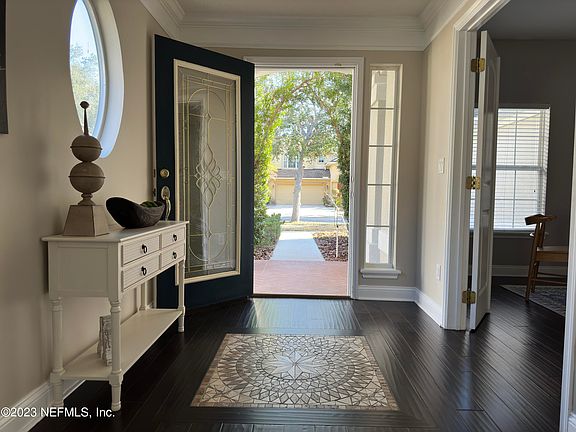 Lakefront living in beautiful Bartram Springs. Nestled on a quiet, oak tree lined suburban street, come experience the peace and serenity offered in Bartram Springs, one of Jacksonville's most perfectly situated communities. Central to shopping, restaurants, beaches and right on the St Johns/Duval County line, live in the middle of it all, yet uniquely secluded from the hustle and bustle. With an open floor plan designed by Mattamy, the Rachel model offers room to entertain and relax in comfort and style. Snuggle up to a movie by the warmth of the gas fireplace, or grill lakeside on the lanai and gather outside on the extended pavered deck spaces. Fresh paint inside (12/9/22) makes this naturally bright home move-in ready. Call to schedule your showing today! Gracing the front of the home, Bedroom 4 easily transitions to an office for the remote work or homeschool lifestyle. The Master suite is privately located lakeside.