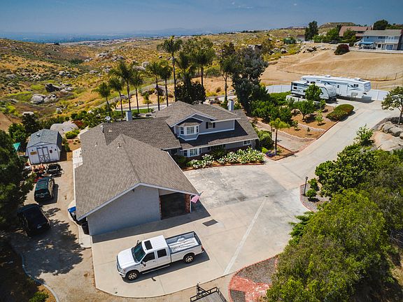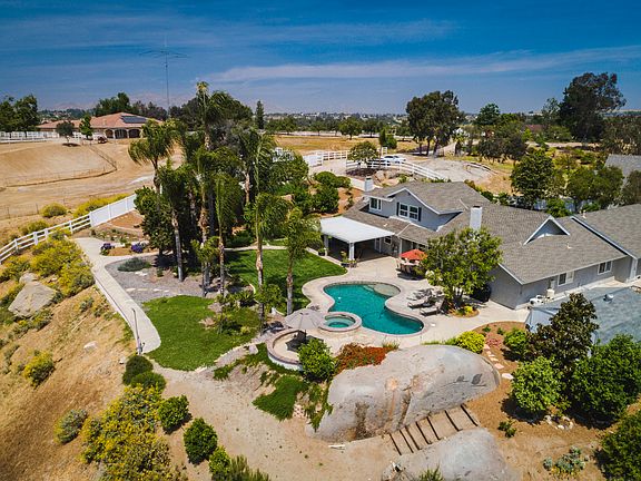 Secluded Estate with 180 Degree Views! Take the extended private driveway with automatic security gate to this beautiful two story completely remodeled home on a 1.95 acre lot. The property features horse facilities with a two stable barn, with corrals and turnouts, to include electricity, water, and washing station. The property has 180 degree view of the Riverside Valley and mountains. The land behind the property is not buildable therefore the view will stay unobstructed forever. The property has 2 RV parking spots with full hookups and dumps, 100 fruit trees, 2 storage sheds, 2 dog kennels, and the tractor on site is negotiable. The residence has 2,776 sq ft. of open space with crown molding, high ceilings, completely remodeled kitchen and bathrooms, brand new windows/plantation shutters, tile flooring, and a custom bar. The master suite is exclusively upstairs with a large soaking bathtub, walk in shower, his and her closets, granite countertops, and vanity space. The home has brand new AC, water heater and literally everything has been updated, replaced or remodeled in the last 7 years. Outside you will find an alumawood patio with ample outdoor living space, lush landscaping and a brand new pool/spa with a removable fence. This home is a true hidden gem that you do not want to miss!