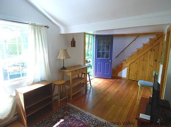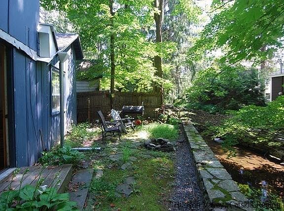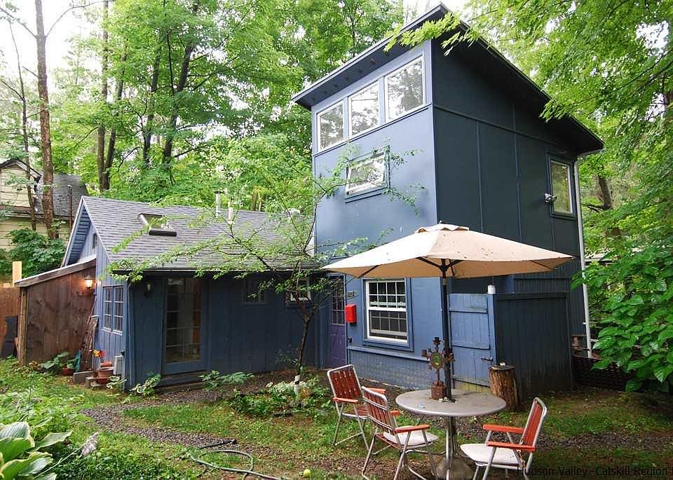 Woodstock Village pied-a-terre for romantic getaways or full time living. Perfect one bedroom contemporary cottage set along historic Tannery Brook. Wonderful outdoor stream side space for has its very own fire pit for late night conversations and relaxation. Working kitchen has pass through to intimate dining area. Open living room area with hardwood floors has a staircase that leads to second floor bedroom awash in light from clerestory windows. Wake up to treetops and birdsong. Perfect for those seeking a retreat from the world while still being nestled in the heart of Woodstock Village. Walk to restaurants, shops, movie theater, galleries and NYC bus. House can be available partially or fully furnished or can be emptied. So your home away is ready to go, simply add your personal touches to make it your own. Finish that novel you have been neglecting!