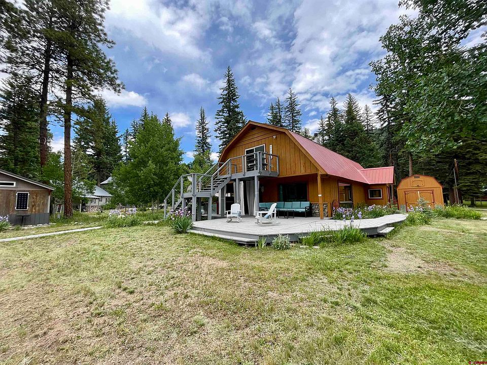 Income Potential! ; Furnished ; Vallecito Creek ; Tiny Home ; Short Term Rental Available. Welcome to this stunning home nestled alongside the picturesque Vallecito Creek. As you step inside, you'll be greeted by an abundance of natural light that fills the living room, creating a warm and inviting atmosphere. Large windows offer captivating forest views, perfectly framing the breathtaking scenery that surrounds the property. The main level of this home boasts a thoughtfully designed layout, featuring two spacious bedrooms, a well-appointed full bathroom, and an open-concept kitchen, living room, and dining area. The heart of the living space is adorned with a grand centerpiece wood stove, adding both charm and practicality to those cozy evenings spent indoors. Upstairs, the second level offers a private retreat with a comfortable bedroom, a full bathroom, and a deck with stairs that overlook the mesmerizing cascade of the creek below. Adding to the allure of this property is a delightful tiny home, situated close to the creek's edge, complete with a loft area. This charming space provides versatile options. There is another insulated building that would make a great artist's studio, a private office, or even a guest retreat. Outdoors, a well-designed gathering area beckons, featuring a fire pit that invites you to unwind and create lasting memories with loved ones. The soothing sounds of the creek and the peaceful ambiance make this spot a true oasis for relaxation and connection. Convenient proximity to a wealth of outdoor activities. Whether it's hiking, fishing, or simply exploring the natural wonders of the area, you'll find yourself immersed in the beauty of Vallecito Creek, and just minutes from Vallecito Lake. Schedule your private showing today and experience the enchantment for yourself.
