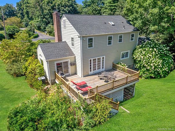 Classic Devoe Road colonial! A covered front portico welcomes you to this timeless traditional 3-bedroom, 2.5-bath colonial-style home. The spacious living room, anchored by a wood burning fireplace and lined with custom bookshelves enjoys radiant sunshine from the oversized true divided light picture window overlooking the front of the residence. The living room adjoins the formal dining room, lined with chair rail moldings and enhanced with crown and base moldings, gleaming hard wood floors and double French doors opening to a rear deck to make alfresco entertaining effortless. The gourmet eat-in kitchen is heartily equipped with a Bosch cooktop, double in-wall ovens and dishwasher, plus a Sub-Zero refrigerator, set along natural stone countertops and complemented by a built-in buffet with glass-front display cabinets, all topped with a tin ceiling. The inviting den features high ceilings, large picture windows, built-in display cases, a flagstone floor and a sliding glass door accessing the rear deck. A neat home office with loft supports work from home or sleep/study. A powder room is discreetly tucked in the entryway. A tidy mudroom with covered exterior entry and interior garage access finishes the main level. Upstairs reside three generously proportioned bedrooms and two full bathrooms, including a front-facing bedroom with ceiling fan and hardwood flooring, and a front-corner bedroom with two exposures, ceiling fan, and wall-to-wall carpeting with hardwood flooring beneath, both of which share a rear-corner bath with shower over tub. The opposite corner hosts the primary suite outfitted with a wall of closets and built-ins, including a cozy window bench and a private ensuite bath. The lower level provides lots of room for recreation and utility. A rear-facing divided light picture window brings natural light into two large adjoining recreation rooms with egress from a door to the flat rear yard. A laundry closet and a utility room with a bunker-like storage closet complete the lower level. This classic 1950s home has a flat easy driveway and rare, flat-as-a-pancake yards surrounded with lush and mature landscaping. A new roof was added in 2025, as was a new Roth above-ground oil tank. The neighborhood is one of the most sought-after locations in Chappaqua with close proximity to schools and access to a sidewalk to shops, town and train. A prime offering.