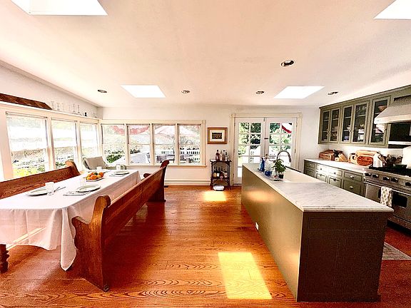 sq. ft. of living space. A warm and inviting living room and family room are perfect for relaxing evenings and entertaining guests. The sun-filled dining room has a large table, and walls of windows, and a large, luxurious kitchen has stone countertops and custom cabinets, plus convenient French door patio egress. Bedrooms are delightfully furnished and also get great natural light. The rear deck is perfect for dining al fresco, and this gorgeous location in Sag Harbor Village cannot be beaten, with elevated shops, dining, marinas, and bay beaches all close at hand.