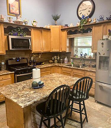 - Included: Free-Standing Electric Oven, Microwave, Refrigerator