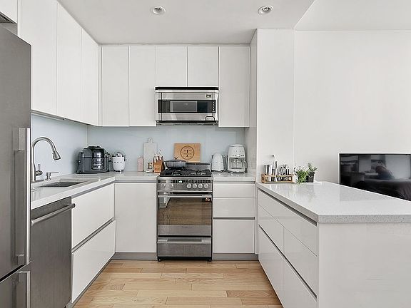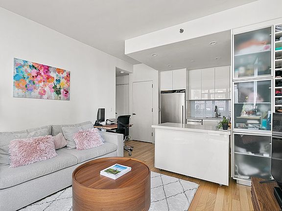 The open-concept interior along with the floor-to-ceiling windows exudes natural light throughout and offers plenty of space for a living and bedroom area and separate office space for those who work from home. The kitchen boasts custom white lacquer cabinetry, quartz stone countertops, glass backsplash, ample storage, and high-end stainless steel appliances including a dishwasher. Indulge yourself in a bath with a deep soaking tub, an oversized rain shower, custom walnut vanities with great storage, and modern Vasser fixtures.