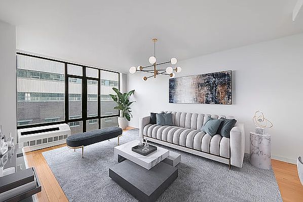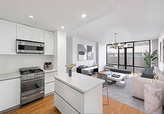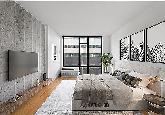 Pristine 1-bedroom, 1-bathroom home exemplifies modern city living. The apartment includes beautiful white oak hardwood floors, wall-to-wall floor-to-ceiling windows with northern exposure, and through-wall A/C. A welcoming foyer adorned with a coat closet flows into an open-concept living, dining, and kitchen space saturated with natural light. The kitchen is equipped with a mobile eat-in island, sleek white quartz countertops, custom white lacquer cabinets, soft-close drawers, a built-in pantry, and a suite of high-end stainless steel appliances from Fisher & Paykel. The spacious bedroom boasts a massive walk-in closet and can easily accommodate a king-size bed. The bathroom has porcelain tiles, a walnut vanity and medicine cabinet, sleek fixtures, and a shower/tub combination with an oversized rain shower head. ONE48 is a full-service condominium located in Kips Bay. Residents enjoy a 24-hour attended lobby, on-site automated parking, bicycle and private storage, a live-in super, a media room/lounge, and a furnished rooftop deck with open city views. The building is close to a variety of restaurants, bars, cafes, and shops, and it has easy access to Madison Square Park, Gramercy, Eataly, the Flatiron District, and NoMad. Nearby subway lines include the 6/R/W. Pets are welcome.