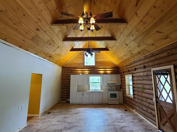 Presenting an exquisite updated round log cabin situated on a spacious lot of just over 5 level acres. Indulge in relaxation on the covered porch, taking in the picturesque views that surround you. Inside, discover a tastefully updated interior featuring an open kitchen, living room, and dining area adorned with high ceilings, creating an inviting ambiance. The master bedroom impresses with its three closets, while the unique master bathroom boasts two separate sinks and a luxurious walk-in shower. The cleverly designed guest bathroom is split into two rooms, one equipped with a sink and toilet, and the other with a sink and shower/tub combination, ensuring utmost convenience for all occupants. Enjoy the elegance of gorgeous hardwood floors throughout the cabin. A striking copper roof adds to the cabin's charm. Noteworthy features include double-insulated pumping pipes, a moisture barrier covering the entire crawl space, and elevated A/C ducts for enhanced functionality. To ensure an informed offer, the buyer is encouraged to verify all information and measurements independently. This extraordinary log cabin is a must-see, embodying the epitome of rustic luxury living.