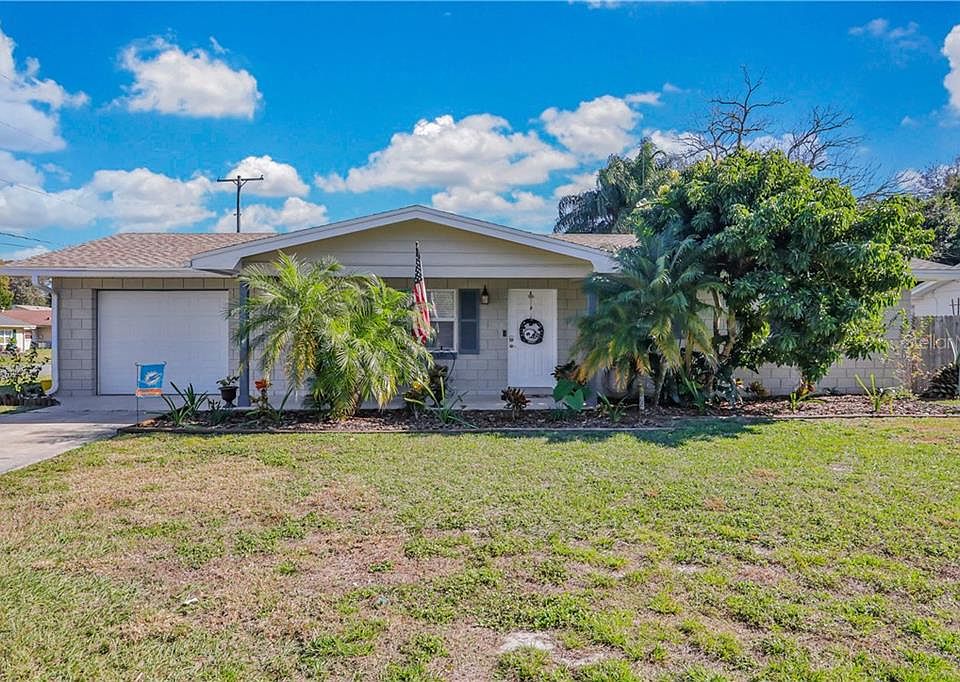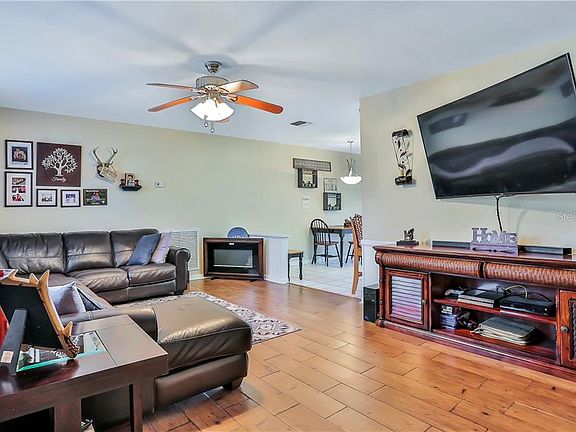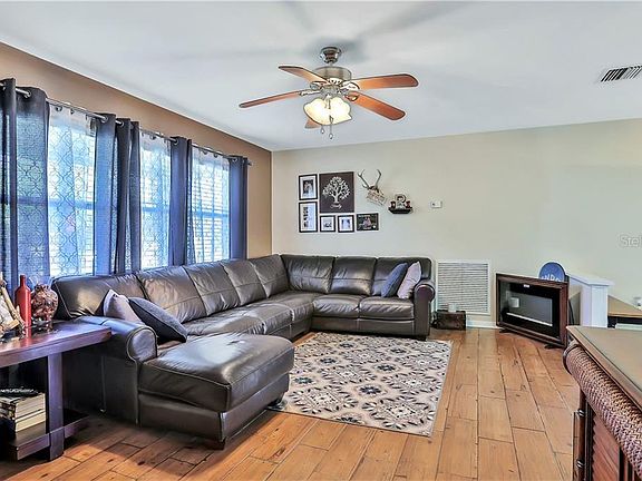 HERE'S A GREAT ONE! Beautifully Updated Pool home in Garden Grove is a great place to call home! Situated on a corner lot, in 2019 this home got a completely new A/C system and double pane windows; the entire pool screen was replaced in 2020. Gorgeous wood-look tile covers the living room floor to meet the L-Dining room and beautiful kitchen with granite counters, breakfast bar and stainless appliances. From the dining room, a wide opening leads into the spacious Family room. The en suite master has carpet flooring and an attractively remodeled shower bathroom. The walk-in shower is full-size, handsomely tiled and has glass sliding doors. The additional bedroom is carpeted and has use of the main bathroom that has a lovely update, tile walls with glass tile insert surrounds the tub area and a large vanity provides plenty of storage. A large utility room has a wood beamed ceiling and houses the laundry area with room for storage plus an exterior door to the screened lanai. The lanai has a great seating area with ceiling fan where you can enjoy relaxing by the pool in the shade. There is a large shed to store pool and lawn equipment and the entire backyard has privacy fencing. A great feature of this home is the Maintenance Free Blocks, which are also exposed in the family room and utility giving a uniqueness to this lovely home. Call today to schedule a private viewing and to make your offer, it will sell quickly!
