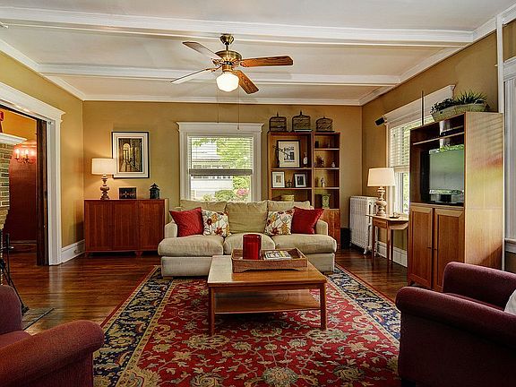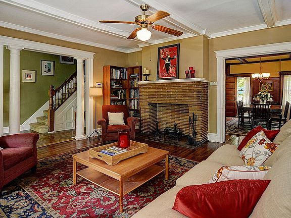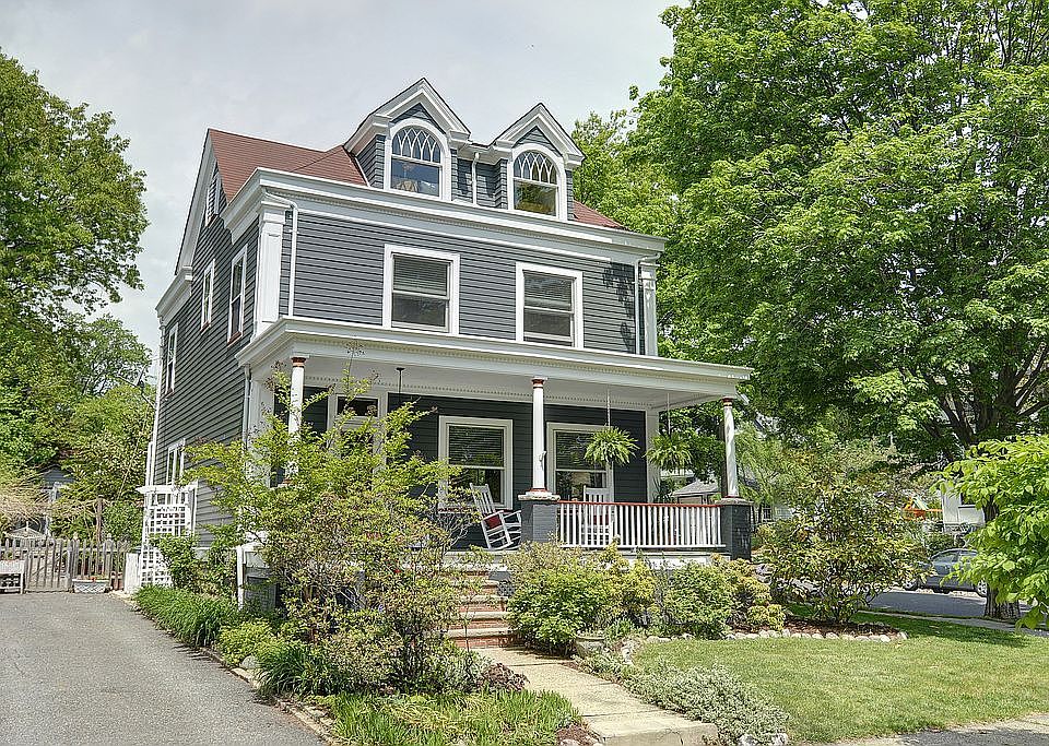 Porch dreams do come true! Inviting lemonade front porch colonial on tree-lined street in sought-after Glen Ridge awaits you. Features of this sun-filled home with 5 bedrooms and 2 baths include a striking 3rd floor primary suite with en-suite bath and walk-in closet. Updated suite showcases sun drenched oasis with separate home office space through decorative arched windows a perfect recharge space. On the 2nd floor are 4 good size bedrooms, one ideal as home office and a full bath with clawfoot tub. Stunning architectural details throughout include high and coffered ceilings, hardwood floors, molding and trim, columns in the spacious living room with wood-burning brick fireplace and gorgeous pocket doors with leaded glass inserts into the formal dining room with plate rail. Dining room is ideal for large gatherings and leads to the working kitchen with shaker cabinets, wood block counters and stainless steel appliances plus a pantry nook leads to the outside. There, a wonderful surprise is found in the deep fenced yard, a lovely nestled setting creating a secret garden sanctuary for outdoor gathering and enjoyment. Additional features are CA on 2nd and 3rd floors, partially finished and easy to update basement, terrific storage and laundry. Minutes to top-rated schools, Glen Ridge and Bloomfield train stations, parks and nearby shops and restaurants. Enjoy the view from your porch, have fun at your neighborhood block parties come home to Glen Ridge!