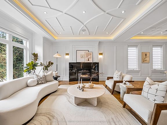 Introducing 148 Munro Blvd an iconic, custom-built residence by Casa Unique Homes, ideally situated on a quiet, dead-end street in the prestigious York Mills neighbourhood. This newly constructed 4+1 bedroom, 7-bathroom home spans approximately 6,300 sq. ft. of meticulously crafted living space. The stately limestone façade, handcrafted mahogany front door, and built-in garage set the tone for the refined elegance found within. Inside, soaring ceilings, wide-plank oak floors, and a private elevator to all levels create a seamless blend of luxury and convenience. A custom staircase with 14K gold accents and a marble foyer with brass inlay showcase the home's bespoke artistry. The open-concept living and dining spaces are anchored by a marble-surround gas fireplace and a showpiece glass-encased wine feature. The chef-inspired kitchen is outfitted with natural Italian marble countertops, a large island, premium Wolf and Sub-Zero appliances, and custom cabinetry by ArtHaus. At the rear, the family room centres around a striking bookmatched Panda marble fireplace and opens to a bright breakfast area with a walkout to the manicured backyard. Upstairs, four oversized bedrooms each include walk-in closets with Di Lusso systems and private ensuites. The primary suite is a private sanctuary, featuring a marble fireplace, dual walk-in closets, a spa-style six-piece ensuite with steam shower and heated floors, and a walk-out terrace. A skylight-lit hallway and second-floor laundry complete this level. The walk-out lower level includes heated floors, an oversized rec room with a gas fireplace, the fifth bedroom with an ensuite, a second laundry, a full wet bar with leathered stone counters and an island, a dog wash station, and a private wellness zone with a sauna, jetted tub, and tranquilly garden. The landscaped backyard includes a fire pit lounge area and is pool-ready, with city-approved permits.
