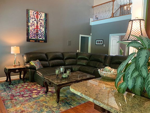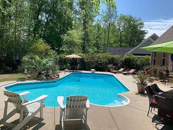 Wonderful Plan features Owner Suite and additional BR/Office on main floor. Spacious Kitchen and Breakfast with Bar and lots of glass opening onto deck overlooking salt water pool with water feature. Great Room with 17ft ceilings and gas fireplace. Master bath with jacuzzi tub, tiled shower and enlarged walk-in closet. 2nd floor has 2 bedrooms with Jack & Jill bathroom, 5th BR/Bonus Room. Hardwood, tile & carpet flooring. Lots of closet spaces. 3 separate attic spaces. Country rocking chair front porch. Large newly built shed in landscaped yard with outdoor lightening. Security system and sprinkler system.