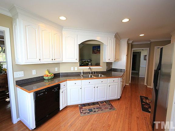 Cute and convenient Clayton ranch! Enjoy open concept, one-level living w/2-car garage & great neighborhood amenities. Hardwood floors welcome you into the home and extend into the kitchen and dining area. Lots of nice details: smooth ceilings, crown & chair moldings, tray ceilings, & brick-front gas fireplace. Double tray ceiling in master suite, plus large walk-in closet, double vanity & soaking tub! Deck has retractable awning for enjoying the private backyard. Don't delay - see it today!