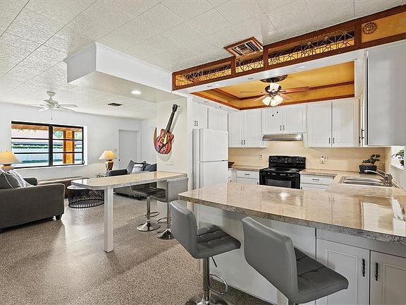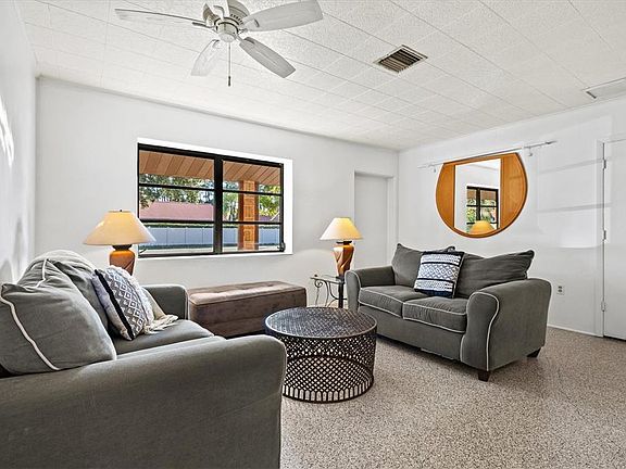 This single-family home sits on over a third of an acre just five minutes from the beach and is located in Flood Zone X, meaning no flood insurance required. Framed by lush landscaping and soaring palms, the property offers charming curb appeal with covered parking and a single-story layout. Inside, freshly painted interiors and classic terrazzo flooring create a bright, beach-ready atmosphere. The kitchen features generous barstool seating and ample prep space, making it ideal for everyday living or entertaining. The main bedrooms are conveniently located near the bathroom, while the third bedroom is perfectly suited for a home office, nursery, or flex space. French doors open to a screened lanai overlooking the expansive backyard, which offers room to add a pool, outdoor living space, or private garden oasis. An outdoor shower provides the perfect finishing touch after long days at the beach. This home is an excellent starter home, second home, or investment property, offering an affordable price point near the coast just off Tamiami Trail. Zoned for A-rated schools, including Laurel Nokomis School and Venice Senior High, the location is hard to beat. Enjoy proximity to beaches, shopping, dining, golf courses, and the convenience of nearby grocery stores and Starbucks, all while benefiting from easy commuting access.