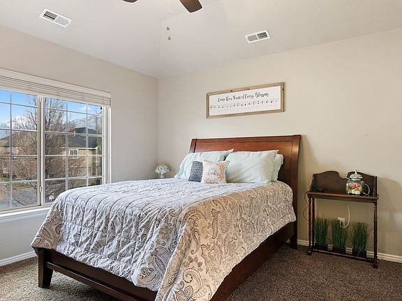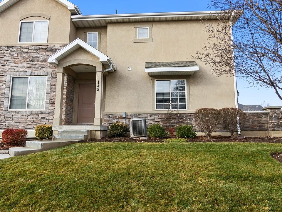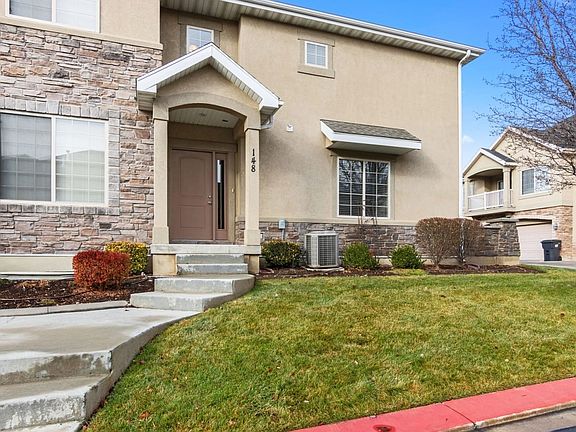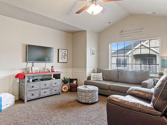 Town home is part of three units to a building. Two in front, one in back. Inside entry is on the main floor with stairs leading up to home which is all on one floor. Walk in master closet, laundry room, balcony off dining area. Yard maintained by HOA but has large flower beds you can plant in. Small gated community has only two streets with a clubhouse, theater room, work out room, outdoor basketball, swimming pool and hot tub. Large green spaces between buildings.