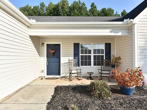 Move in ready! This 3/2 ranch home with a rocking chair front porch, is situated on a level lot with a private wooded backyard. It is a split bedroom plan that has a master suite with trey ceiling, dual vanities, garden tub/separate shower and his & her closets, generous secondary bedrooms that share a full bath and a vaulted great room with a fireplace. Dont wait. this home is a must see!