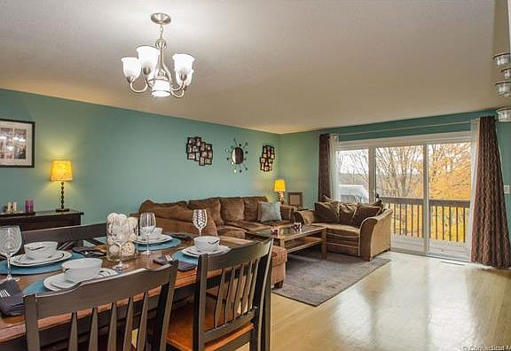 This very spacious two bedroom condo offers a master bedroom en-suite bathroom with an additional bedroom en-suite bathroom and so much more! Cozy up and enjoy a beautiful view of woods from your living room with a fireplace and a slider onto the deck. Two of the three bathrooms have been updated. This unit also includes an attached extra long garage with a storage closet and space for a possible second car.