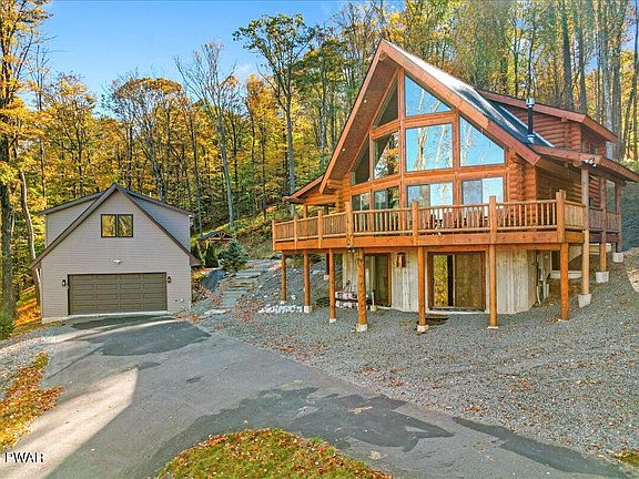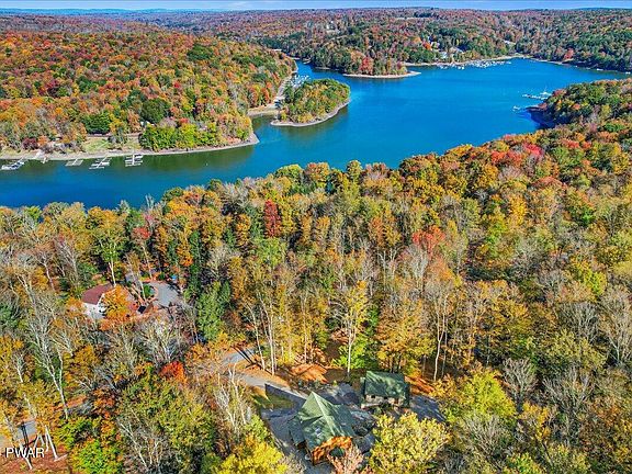 Stately Montana Log Chalet with lake rights. and boat slip available on motor boating Lake Wallenpaupack. House built of whole logs from Montana, which even accent the interior. as pillars of grandeur. Towering ceilings and lots of windows. Open concept design. Modern kitchen with granitite countertop and stainless steel appliances. Central air, fireplace. Wiring for camera system. Private primary suite with walk in closet and loft area. Large wrap around open and covered deck, plus a side and back covered porch. The large detached garage has plenty of room for cars and workshop space. Above garage and with its own separate entrance, are finished and furnished bonus rooms for recreation, additional privacy and comfort, or whatever your particular needs may be. These bonus rooms have split unit heat/air conditioning. There is also storage space above these bonus rooms with access by pull down steps. Outside areas include a furnished pavilion with electric outlets and stadium style lighting for night entertaining, a hot tub, and archery range. Bring your 4 wheelers and golf carts. A boat slip on the lake awaits you. Private location, yet close enough to I-84. for convenience. Commutable distance from NYC and other major metro areas. Turnkey, furniture included...just pack a bag and begin ''Living the Dream''!