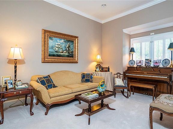 - Interior: Entrance Foyer, Bookcases, Double Vanity, High Ceilings 9 ft Main, Beamed Ceilings, Tray Ceiling(s), Carpet, Disappearing Attic Stairs
