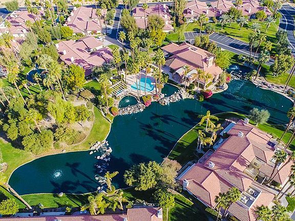 Originally a model home in the PARK PALMS gated community. Open kitchen, dining and living area with porcelain tile, granite counters, and fireplace The first-floor primary bedroom offers walk-in closet, dual vanities, and oversized shower. Luxury wood-plank flooring, fresh paint and volume ceilings Gorgeous lakeside view with its bridges, fountains and waterfall. West-facing front patio is great for morning coffee. Upstairs, a spacious second master bedroom includes a full bath and walk-in closet. Giant loft completes the second floor as a THIRD bedroom, entertainment space, or large office. Easy access to freeways, schools, parks and The Shops and Eateries at El Paseo! Includes full A/C, private two-car garage with automatic door and driveway. Plus, the clubhouse, 3 swimming pools, jacuzzis, tennis, pickleball courts, weight room. Great mountain views! NEW: oven & stove, microwave, dishwasher, refrigerator, washer/dryer, toilets, garbage disposal, sinks, garage-door-opener, light fixtures & switches. First and Security moves you in.