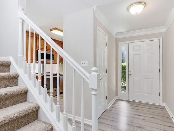 Incredibly rare combination for a townhouse: owner's suite on the main (plus 2nd master option up!), 2-car stepless garage on the kitchen/main level, laundry on main, huge deck and walk out private backyard. Fee Simple, NO HOA DUES. Vaulted living room with gas fireplace, open to dining and views to eat-in kitchen, deck, patio. Both beds have large walk in closets, en suite bathrooms. Huge 3rd bonus room- office or great storage. Quiet cul-de-sac with walking trail for shortcut to Merry Lane! New roof, flooring, deck, appliances and more! NO RENTAL RESTRICTIONS. Taxes do not reflect homestead exemption.