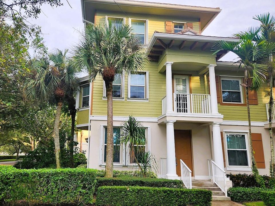 Beautiful corner/end unit. 3 bed, 4 baths. First Floor is a Tiled flex room with bath, would make a great theater, man cave, game room or extra living area! Bay window in great room on second floor and a covered balcony, bamboo flooring. Accordion shutters on 2nd and 3rd floors. Granite counters w/ stainless appliances, kitchen breakfast bar open to dining room. Just painted, new carpeting in bedrooms & light fixtures. Ready to move in! Exterior just painted and entire interior New Toilet & seat covers. A/C 2015, water heater 2016. New roof tiles installed over Garage. Taxes reflect NON Homestead. Low HOA fees. Across from park. Many community amenities, walk to clubhouse pool & mailbox