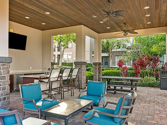 • Exterior features: Contemporary Kitchens, Designer Custom Cabinets, Double Bathroom Vanities, Flooring: Wood, Outdoor Entertaining Pavilion with Flat Screen TV, Pet Park, Rentable Storage Closets Available, Resort Style Summer Kitchen with Grills, Stainless Steel Appliance Packages, TV Lounge, Tennis Court(s), USB Charging Ports, View Type: Beautiful View of Clermont & Surrounding Area, Walk-In Showers Available