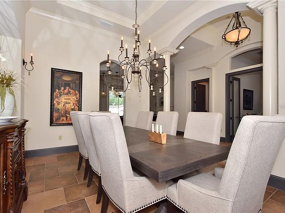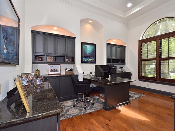 - Interior Features: Ceiling Fans(s), Eating Space In Kitchen, High Ceiling(s), Master Bedroom Downstairs, Open Floorplan, Split Bedroom, Stone Counters, Walk-In Closet(s), Crown Molding, Solid Wood Cabinets, Thermostat, Kitchen/Family Room Combo, Solid Surface Counters, Window Treatments, Wet Bar, Tray Ceiling(s), Coffered Ceiling(s)