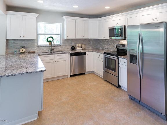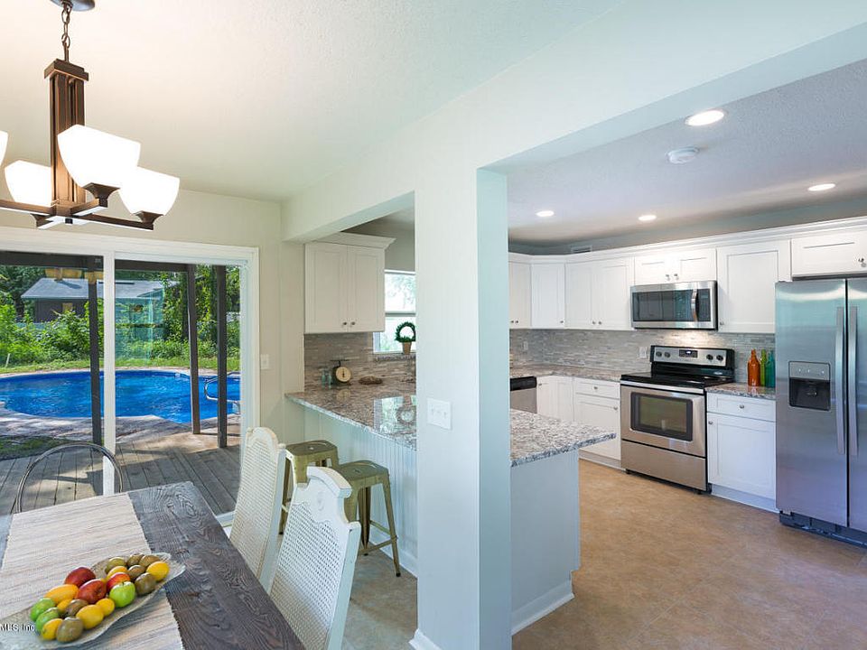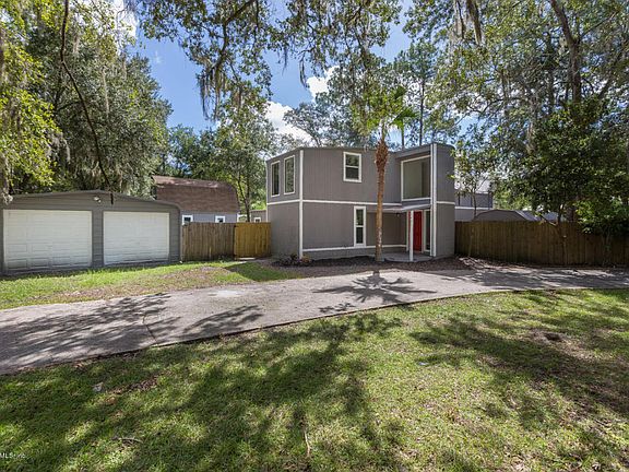 Tucked away in Fruit Cove, this recently remodeled pool home feels like new inside. There are 4 bedrooms and 3 full baths in this 2 story, 3000 sqft contemporary beach cottage. Step out of nature into a grand entrance with high ceilings, floor to ceiling windows, and new flooring throughout. The large kitchen boasts white shaker style cabinets, granite counters, and stainless appliances. Master suite has a beautifully renovated bath and sliding barn door for walk-in closet. Other features include: fenced yard, multiple decks and outdoor seating areas on each floor, inside laundry room, detached 2 car metal garage, 2 story barn shed, bonus room upstairs, new roof, and new windows.