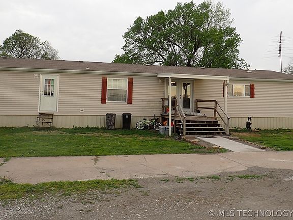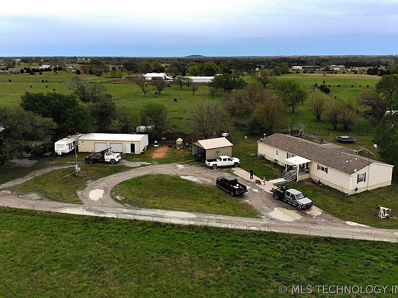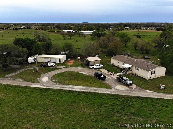 Do you need some WIDE OPEN SPACES? This spacious 4-bedroom manufactured home on 5 acres m/l offers plenty of space for a large family, 2280 sq ft., 2 full bathrooms and 4 bedrooms. Additionally the house features an office area in an expanded hallway, perfect for those who work from home or students doing homework. The open kitchen and dining room provide a great space for special occasions and entertaining guests. The living room adds a cozy atmosphere for those family gatherings. An additional den, complete with a fireplace, adds the extra space for a game area, theater room or additional family space. The master suite is a standout feature of this home, featuring a large garden tub for relaxation, separate shower and spacious closets for storage. Covered front and back porches are the perfect sitting areas for enjoying the Oklahoma sunrise or sunset. Property also includes 4 additional outbuildings including a 20x40 shop with concrete floor, Haybarn with lean-to, storage shed and a tack shed with lean-to for an animal enclosure. 3 pipe holding pens with water access will make working the animals a little easier. Oversized carport will fit large truck and another vehicle The country location offers a peaceful and serene environment, away from the hustle and bustle of the city. Located at the end of a circle drive, this property is ideal for a large family seeking a comfortable and spacious home in a tranquil country setting! MOTIVATED SELLERS!