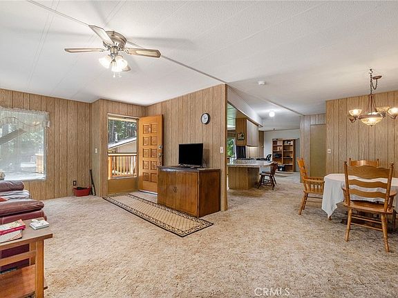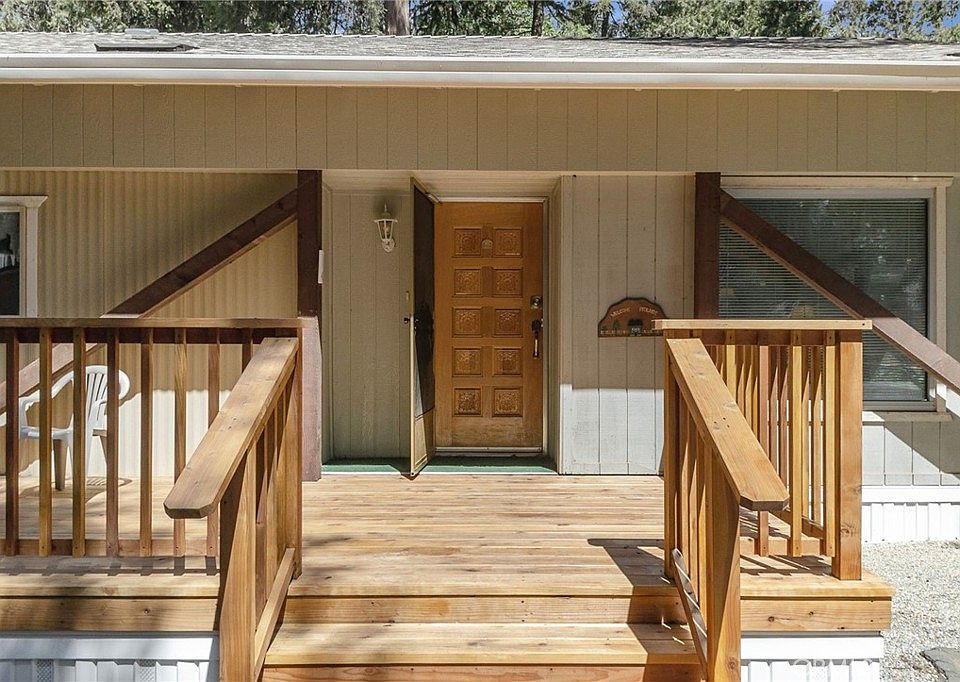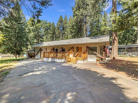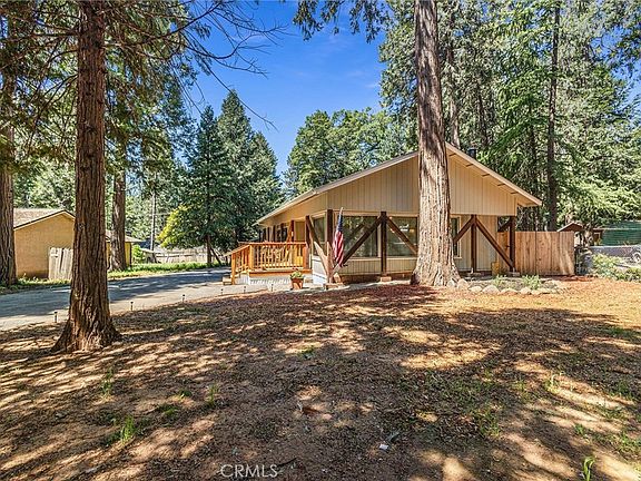 This well-maintained home is tucked away among the pines, featuring an amazing new Ramada roof and new redwood decks at both the front and back. The living room, equipped with a Fisher wood-burning stove, flows seamlessly into the dining area and kitchen, which boasts ample counter and cabinet space, as well as an upgraded stainless steel gas stove. Dishwasher and refrigerator were replaced in the last few years. Beyond the kitchen lies an additional living space, leading to the main and guest bedrooms. The property includes a single-car detached garage, an insulated shed in the backyard with alley access, and an owned propane tank. Additionally, the seller is including a dual-fuel generator that operates on gas or propane and other items.