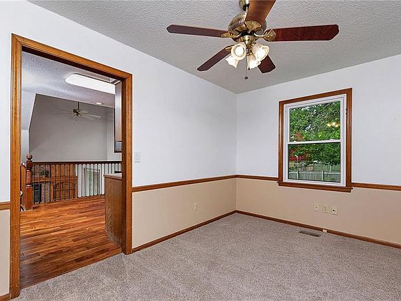 A must see FOUR BEDROOM in Olathe! This home has open eat in kitchen area with beautiful hardwood floors over looking family room with fireplace. Formal dining, atrium window, open stair cases with new wrought iron spindles. New windows in 2015, new attic fan, new carpeting in halls and stairs on upper level. Smart thermostat. Yard is fenced and has a play house that can stay. Hidden play area is in the Fourth Bedroom attic.
