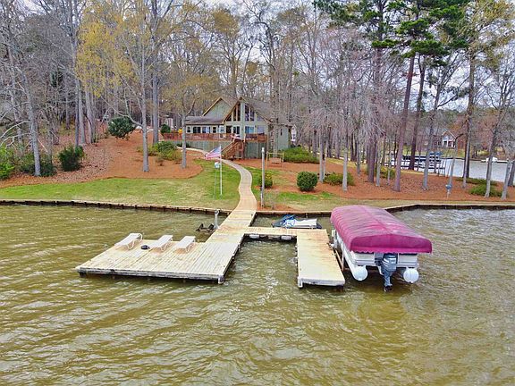 Life is better at the lake in this spacious family retreat. The open floor plan serves as the perfect setting to gather for meals, games, and conversation. The kitchen includes all appliances and a walk-in pantry. Enjoy expansive views of the lake from sunrise to sunset through oversized floor-to-ceiling windows. A full deck with handicap access allows for lots of outdoor seating to enjoy the beautiful lake views. There is also a basement/crawlspace accessible from under the deck. With 300 feet of lake frontage/seawall, there are plenty of options for fishing from the edge of the property. An electric boat lift and two jet ski lifts attached to the dock, which features 9 feet of water depth, provide easy access to lake activities. The main level features a master bedroom/bath and an additional bedroom and hallway bath. Upstairs, there is another bedroom and bathroom with entrance to a huge bonus/game room over the garage that can also provide extra sleeping space for more guests. A covered back deck overlooks a fenced in garden that can serve as an outdoor area for small pets. A 3-car garage adjoins the small deck and includes plenty of storage capacity. Stable community, easy access to I 20