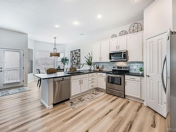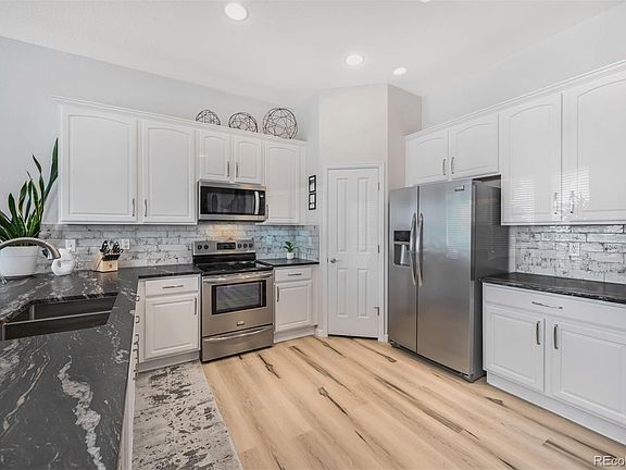 Discover luxury and effortless living in this stunningly renovated ranch home, where every detail has been meticulously designed for both style and comfort. Updated just two years ago with high-end finishes, this home is turn-key. From the moment you step inside, be wowed by gorgeous vinyl plank flooring, high ceilings, and sleek oil rubbed bronze steel stair railings that add a modern touch. Flooded with natural light, the open-concept living room, kitchen, and dining area are the heart of the home—perfect for entertaining or relaxing. The modern kitchen is a chef’s dream, featuring leathered granite countertops, crisp white cabinetry, SS appliances, stylish backsplash, & peninsula bar seating. A chic chandelier highlights the spacious dining area, while the living room impresses with a striking tiled gas fireplace. Retreat to the luxurious primary suite, complete with a spacious bedroom, large walk-in closet, and a spa-inspired 5-piece ensuite. Designed in elegant white tones, the bathroom features a dual-sink vanity with quartz countertops, a glass-enclosed shower with a bench, soaking tub, toilet room, and modern tile flooring. An additional bedroom sits next to the fully updated main bathroom, showcasing classy finishes. The versatile office, enclosed with French doors, easily functions as a third bedroom. The large, unfinished basement provides endless potential, along with an expansive crawlspace for ample storage. Outside, enjoy the quaint deck, perfect for relaxing. As a patio home, this property offers easy living with snow removal, mowing, & hedge-trimming included. Recent Updates Include: new roof (2021), new A/C & furnace (2024), new hot water heater (2023), newer flooring throughout, whole house exterior (2024) & interior paint (2022), newer dishwasher (2023), and new ceiling fans & lighting. Near the community park, easy access to shopping, dining, & major highways, this home offers a perfect blend of convenience and charm.