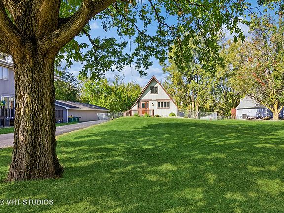 Are you tired of looking at cookie cutter houses, and are ready for something different to come on the market? This may be just what you have been waiting for, as this remarkable home is the best of all worlds! This rare gem sits on a gorgeous, fenced nearly half acre incorporated lot with city water and sewer on a quiet street backing to the DuPage River in the heart of downtown Plainfield. Do you have a trailer, boat, or extra car? You will love the super long driveway and 26 x 22 foot detached garage with a ton of additional storage in its attic. Like to entertain? You will be amazed at the finished walkout basement with recessed lighting that opens to a huge patio under a spectacular deck overlooking the immense yard with incredible views of sunsets over the river. The basement also has an 8 x 19 foot laundry/storage room with space for a second bath. This true A frame home has been so nicely updated too! The gorgeous kitchen is updated in today's most popular finishes and features updated cabinets, quartz countertops, stainless appliances, a stainless farmhouse sink, a lovely glass tile backsplash, and luxury vinyl plank flooring. This flooring extends throughout the entire first floor and through the finished basement. The huge living room showcases a spiral staircase and opens to an awesome deck, which leads to a separate fenced dog run area and the expansive fenced yard. The primary bedroom is on the first floor, as is the full bath. Upstairs, you will find the second bedroom and loft area, perfect for a home office. Other updates of this home include a patio door leading to the deck, glass block windows in the basement installed in 2023, half of the driveway redone in 2022, and a new washer in 2017. This home has the best location, with easy access to Route 59, I-55, and the Plainfield Park and Ride lot, which provides free parking and great weekday commuter access into the city through the PACE bus system. Plus, all of the great restaurants, shops, and activities of downtown Plainfield are just a few short blocks away. Low taxes and no HOA, too! This home is truly the best of all worlds!