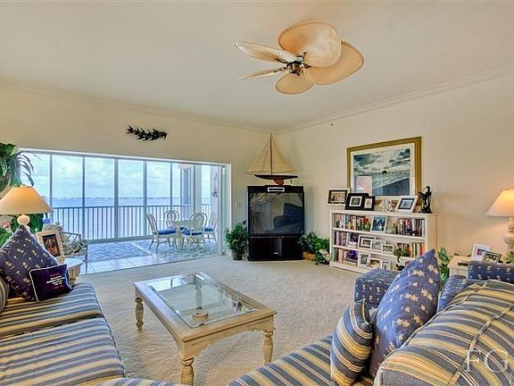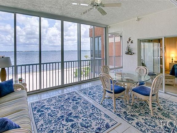 Enjoy spectacular sunsets over the length of the river while sipping iced tea or cocktails from either the large glass enclosed lanai off the living room or the master bedroom. Professionally decorated unit in light airy beach tones. Gourmet kitchen, upscale bathrooms, hurricane resistant glass throughout. Easy access to private beach and fishing pier. Clubhouse with workout room, lovely community pool and spa, quiet private garden with Koi pond. All this at an amazingly low price. Conveniently located next to public marina. Close to Sanibel and beaches.