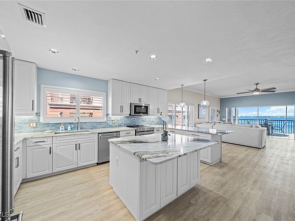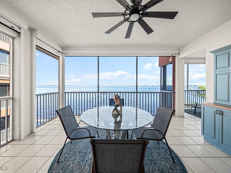 Have you ever dreamt of falling asleep to the gentle sounds of waves from a riverfront beach below your third-floor balcony? Watch dolphins play and seabirds fly at eye level against stunning orange and pink sunsets. This turnkey home is ready to move in, complete with brand-new furniture from Matter Brothers, bedding, towels, cookware, silverware, dinnerware, lamps, artwork, and all essentials for a convenient arrival. Enjoy a second patio overlooking the marina and pool area, offering both sunrise and sunset views. Guest rooms open to the poolside patio, creating a treehouse-like retreat. Located just minutes from Fort Myers Beach and the Sanibel Causeway, Harbor Place at PepperTree Point is a gated community offering residents exclusive HOA amenities and an unmatched lifestyle. Enjoy a resort-style pool with cabana and hot tub, BBQ picnic area, private beach, marina with optional boat lifts, two additional pools, a fitness center, tennis and pickleball courts, expansive green spaces, and a charming “secret garden”. From the secure gated entrance to the convenient in-home garbage chute that makes taking out the trash effortless, Harbor Place combines comfort, enjoyment, and peace of mind in every detail. Renovated in August 2023, this third-floor unit features cross ventilation, luxury vinyl flooring, fresh paint, new fans and lighting, a gourmet kitchen with KitchenAid appliances, large island with gray-blue granite, and a soft blue backsplash. The primary suite is accessed by two double doors and is spacious enough to allow for a sitting area, includes an oversized custom closet, soaking tub, and glass-tiled shower. A second bedroom/office includes a built-in Murphy bed and granite-topped desk. The elevator opens directly into your open-concept living space with river views. Natural light abounds. Hunter Douglas plantation shutters and blinds adorn the windows. Two staircases exit the unit with one leading directly to the beach. Defender hurricane screens (CAT 5 rated) and accordion shutters offer peace of mind. Harbor Place offers comfort, security, and a vibrant community with marina gatherings, book clubs, trivia nights, and wonderful views of the holiday fireworks. Experience the best of the Florida lifestyle in this immaculate, relaxing home.