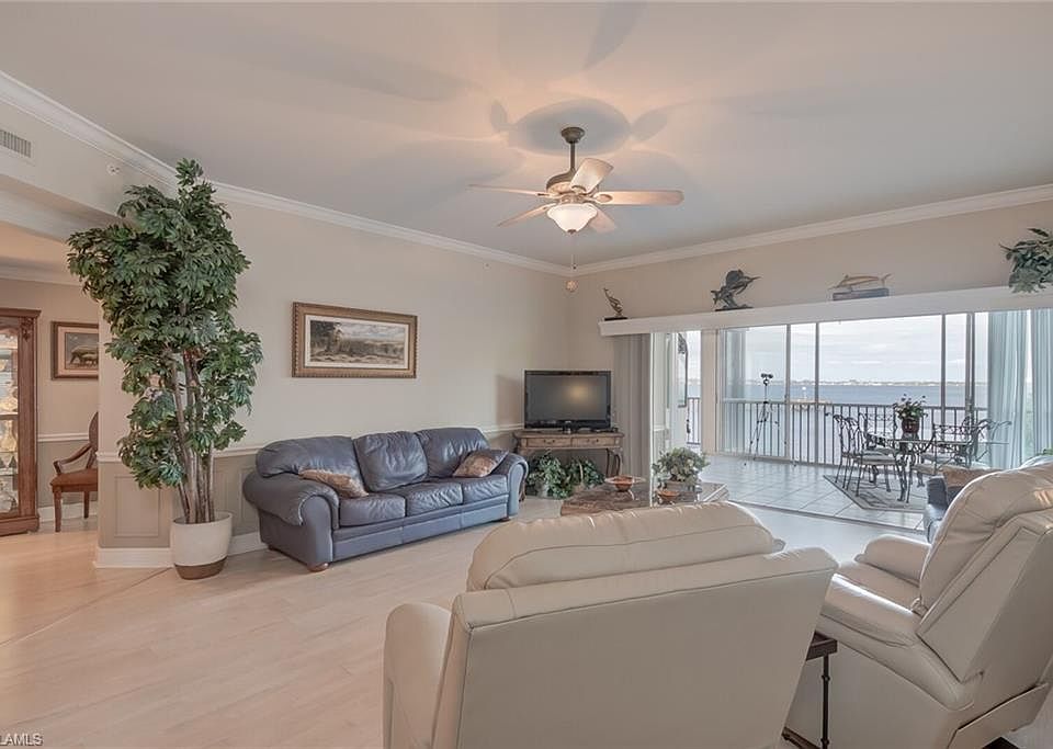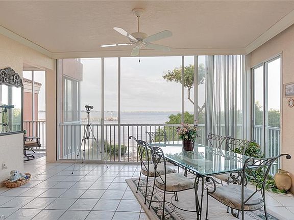 This beautiful condo is the reason we move to Florida! With breathtaking views of the Caloosahatchee River, next door to the community deep water Gulf-access marina, lusciously landscaped community pool, fishing pier and river-front beach, this property is your oasis in the heart of southwest Florida. Spread out in over 2,300 square feet of light and bright living space, plus an enclosed, oversized lanai the length of the rear to enjoy panoramic sunsets over the river. For chillier days, feel free to close the sliders that surround the entire lanai, but leave open the disappearing sliders into the living space to create an enclosed sunroom space. This unit also offers 3 bedrooms, each with access to either a porch or the lanai and 2 very spacious bathrooms. The designer details throughout include crown molding and wainscoting and a fully remodeled kitchen that includes plenty of cabinet space for the most ambitious cook! Speaking of storage, this property offers additional storage on the lanai, in the underground parking, and a huge master closet in the bedroom! The water heater is 2015, and the AC is 2010 and serviced by the HOA. Schedule your private showing today!