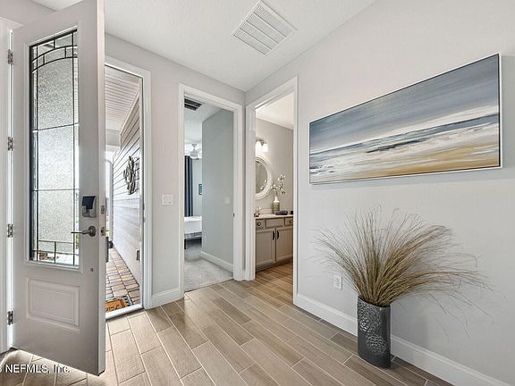 Beautiful porch leads to a glass framed door. Enter and you will see two bedrooms to your left with a FULL bathroom in the middle. All well appointed with upgraded mirror and carpeting. Walk further to an open gourmet kitchen with a solid surface countertop that includes double ovens, stovetop and stainless steel appliances. Primary Bedroom has large windows to allow natural light and upgraded primary spa feel bathroom. Wood look tile throughout, sizable pantry, separate laundry room that leads to the garage with Epoxy Flooring and garage door opener Family room has triple sliders that open to a screen lanai to complete the indoor/outdoor space.