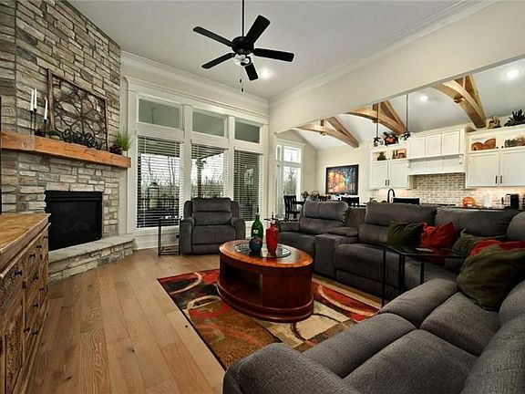 Stunning, former model ranch home on lot backing to trees. First floor offers hardwood throughout the main living space. Soaring ceilings, large great room with floor to ceiling stone fireplace. Amazing kitchen with custom beams, huge island, gas cooktop, stainless appliances, enormous walk-in pantry. Large master bedroom. Master bathroom offers an incredible walk in shower with dual shower heads, dual vanities and large walk-in closet with easy access to laundry room. 2 additional bedrooms on main level, one with attached en suite. The basement is an entertainer's paradise. Huge rec room boasts a wet bar with custom wood top. There are 2 additional bedrooms and full bath. Home offers an exercise room that could easily be an amazing theater media room or even converted to a 6th bedroom if needed. Make sure you check out the secret room! Must see!!