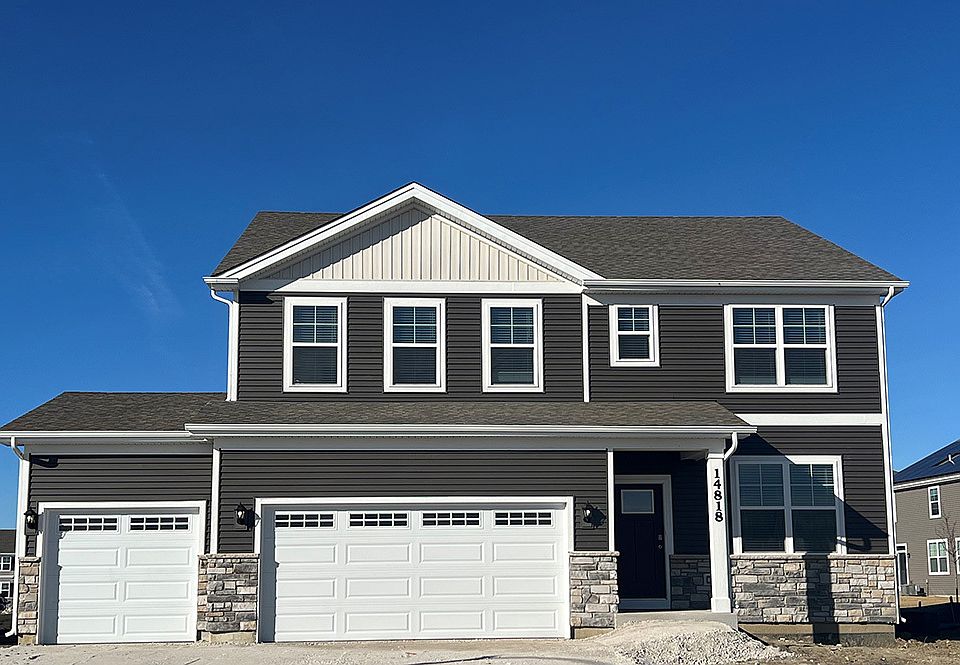 Discover yourself at 14818 S Greenbriar Drive in Plainfield, Illinois a beautiful new home in our Greenbriar community, located in Plainfield North School District 202. This home is READY NOW for an immediate move-in! Homesite includes oversize fully sodded yard, landscape package, and stone accents on the front of the home. The Coventry plan offers 2,836 square feet of living space with a flex room, 4 bedrooms, 2.5 baths, 3 car garage, 9-foot ceilings on the first floor, full basement, AND window treatment! Entertaining will be easy in this open-concept kitchen and family room layout with a large kitchen island with an overhang for stools, 42-inch designer flagstone cabinetry with crown molding and soft close drawers. Additionally, the kitchen features a butler's pantry, modern stainless-steel appliances, quartz countertops, and easy-to-maintain luxury vinyl plank flooring. More flexible space is waiting upstairs with the second-floor loft, offering unlimited potential to suit your needs. Enjoy your private getaway with your large primary bedroom and en suite. The primary bath includes a raised height dual sink, quartz top vanity, and walk-in shower with glass shower doors. Convenient walk-in laundry room, 3 additional bedrooms with a full second bath, and a linen closet compete the second floor. All Chicago homes include our America's Smart Home Technology, featuring a smart video doorbell, smart Honeywell thermostat, Amazon Echo Pop, smart door lock, Deako smart light switches and more. Exterior photo of actual home. Interior photos are of similar home and model home. Actual home built may vary.