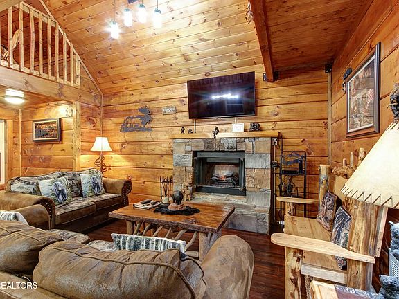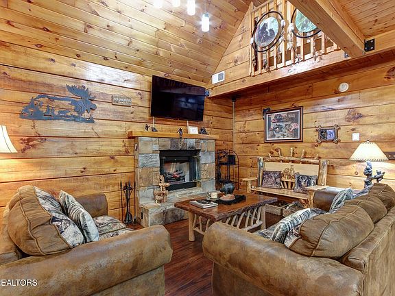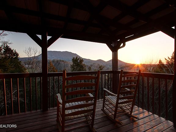 This beautifully appointed cabin with a spectacular view of Bluff Mountain has all the features you need for rental success in the Smokies! The first thing you notice on arrival is the abundance of paved flat parking, a rarity in this area. Entering via the covered porch you experience the great room, with its stone fireplace, kitchen with granite & stainless, dining area with lots of windows, and a distinctive catwalk crossing the cathedral ceiling. A queen bedroom on this level shares a full bath with walk-in shower. Upstairs the loft king bedroom enjoys its own full bath and the catwalk crossing to a sitting area by the peak windows. Downstairs the rec room offers a pool table, bar, and fireplace as well as another sleeping room, and the third full bath that includes a laundry area with full-size machines. There's also a utility room that holds the HVAC, water heater, and water filtration system, all of which are still under warranty! Outdoors there is so much more to enjoy - a 3/4-wrap covered deck around the cabin offers sitting, dining, and cornhole areas, while the the adjoining covered pavilion offers a hot tub and log rocking chairs - all overlooking the mesmerizing vista stretching down to Sugarloaf Mountain. Behind the deck at ground level is a firepit area and charcoal grill for cookouts and another outdoor table for dining al fresco. This outstanding property is less than 15 minutes from Tanger Outlets on the Parkway, with easy secondary road access to all our area has to offer. Already a well-established rental, this cabin is an ideal investment or getaway - schedule a showing soon and see it for yourself!