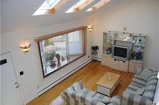 IMMACULATE & UPDATED SPLIT - new roof, skylights, replacement windows, appliances, HVAC, updated baths, cathedral ceilings, hardwood floors. Family room w/ brick wb fp, wainscoating, entry to fenced backyard w/storage shed. Walk to NYC Bus, blue ribbon school, park, shopping and more. Close to trains. Home Warranty!