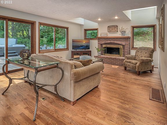 - Features: Fireplace, Hardwood Floors, Living Room Dining Room Combo, Skylight, Sliding Doors, High Ceilings