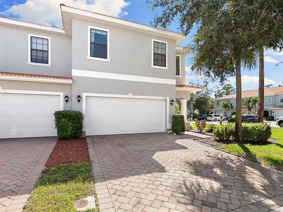 Lowest-priced home in the community! Bask in the Southwest Florida sunshine from this southern-exposure, two-story corner unit in a desirable North Naples gated community. This well-maintained townhouse offers 3 bedrooms, 2.5 bathrooms, a 2-car garage, and an oversized floor plan perfect for families, seasonal residents, or investors. A spacious loft adds flexibility for a home office, media room, or play area. Enjoy light-filled living spaces, manual storm shutters, and a kitchen with granite countertops, built-in cabinetry, and a walk-in pantry. The owner's suite features a large walk-in closet and dual vanities. HOA includes fiber internet, cable, lawn care, pest control, and exterior maintenance for low-maintenance living. Resort-style amenities include a lagoon pool and spa, clubhouse, fitness center, tennis, pickleball, basketball, BBQ areas, and fishing pier. Close to Founders Square, top-rated schools, shopping, dining, and beaches.