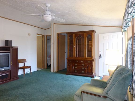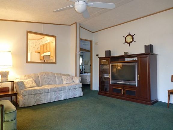 Spotless double wide manufactured home with cathedral ceilings, open/airy floor plan, chandelier dining, kitchen center island, 3 bedrooms and 2 full baths. Master bedroom features two closets (one walk in,) a beautiful bathroom with whirlpool tub, mirror accents and warm wood tones. The side screened in porch leads into the cheerful kitchen, where laundry room is conveniently located.Detached garage built with automatic door opener, electric, on a poured concrete pad for one car and an RV.