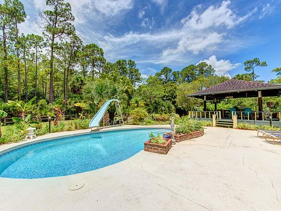 Follow the shady, winding driveway to this beautifully maintained home, situated in a totally pristine 10 acres surrounded by pines, oaks and palms. Hardwood & tile flooring throughout the almost 3000' of living area. The 40'long Florida room has impact windows & sliders, wood flooring and an old fashion wood burning stove. There is a large updated Kitchen, quaint country bathrooms, and a 20' long hobby and utility room. Incredible Park like clearing and back yard with over-sized custom pool, huge gazebo for cook outs and shade, plus stone fountain/fish pond. A virtual forest with the owners own landscape touches includes rare palms and plants. Off the master bedroom there is a screened patio with a greenhouse feel for orchids & tropical plants. See this beautiful home & property today